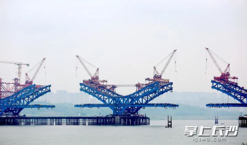 端午小长假期间,暮坪湘江特大桥建设工地施工忙。暮坪湘江特大桥桥梁全长3.928公里,预计今年10月合龙。